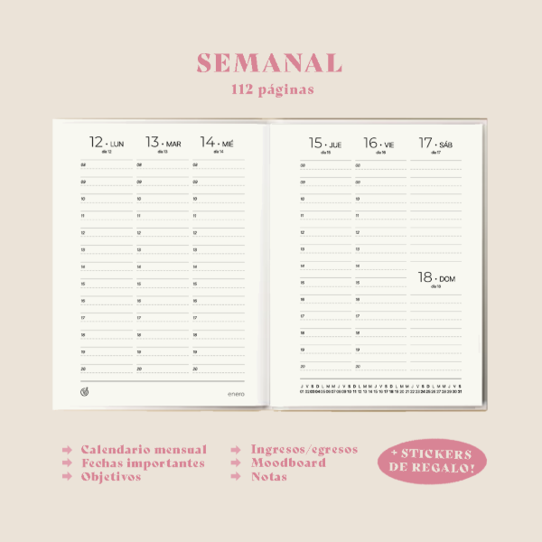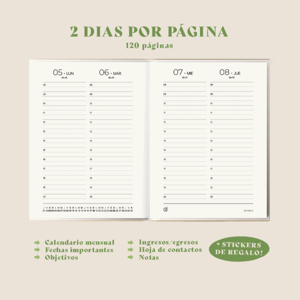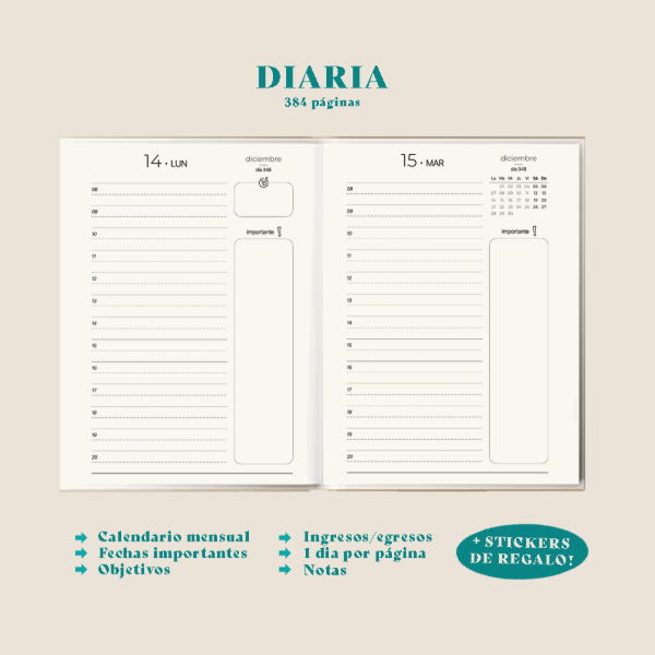 •Interior cosido a elección - semanal, 2 días por página, diaria-